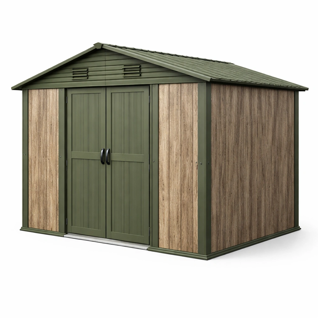 Este cobertizo cuenta con una estructura de acero galvanizado y paneles con efecto de madera. Sus dimensiones son 213 cm de largo, 130 cm de ancho y 185 cm de alto. Presenta un exterior en color Verde con efecto madera y está diseñado para ofrecer un espacio de almacenamiento al aire libre. Incluye paneles y puertas para facilitar el montaje. Las puertas dobles cuentan con un cierre de seguridad y el diseño incluye ventilación para evitar la acumulación de humedad.