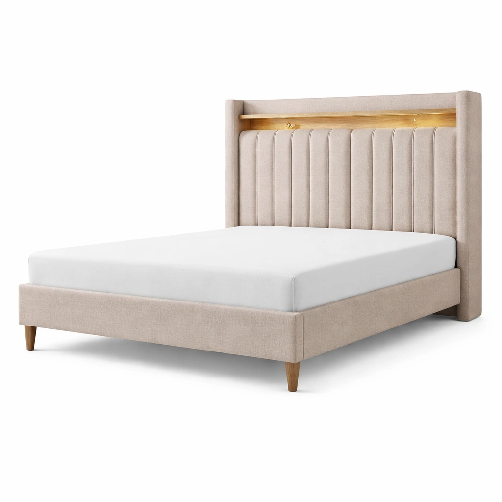 Material: Estructura de madera maciza con revestimiento de lino. Cabecero acolchado con espuma de alta densidad.
