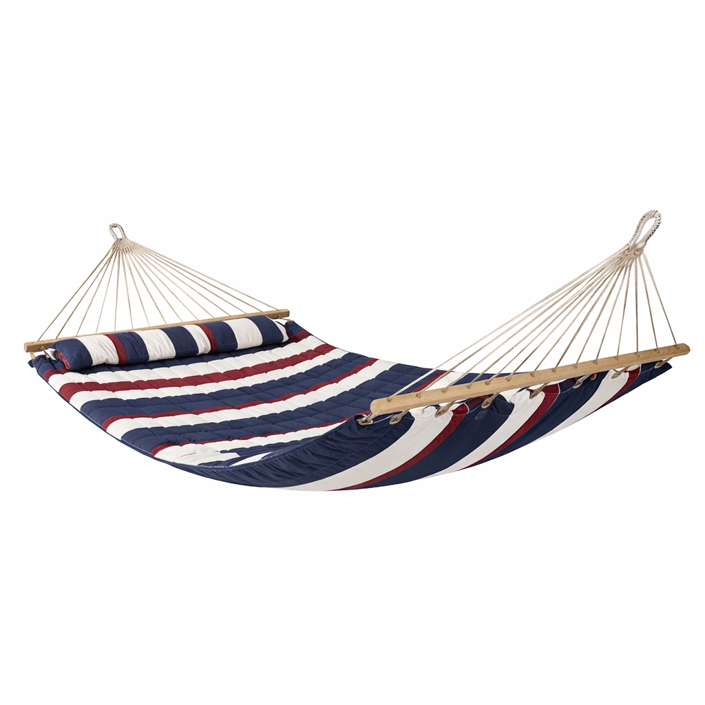 Hamaca con superficie de algodón y poliéster, en colores Azul, Rojo y Blanco. Dimensiones: 200 cm de largo y 140 cm de ancho. Capacidad de carga de hasta 150 kg.